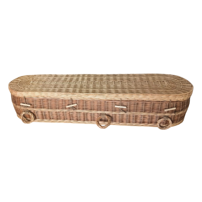 De ovale vorm en het ambachtelijke vlechtwerk zorgen voor een zachte, serene uitstraling. De mand is volledig composteerbaar en voldoet aan de eisen van natuurbegraafplaatsen. Een passende keuze voor wie bewust en in verbondenheid met de natuur afscheid wil nemen.