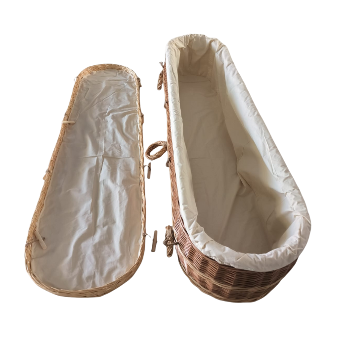 Deze met de hand gevlochten uitvaartmand van wilgentenen is een prachtig alternatief voor een traditionele kist. De warme, natuurlijke uitstraling maakt deze mand bijzonder geschikt voor wie kiest voor een persoonlijke en respectvolle uitvaart. Door het gebruik van onbewerkte, biologisch afbreekbare materialen is deze mand ideaal voor een duurzame begrafenis of crematie.